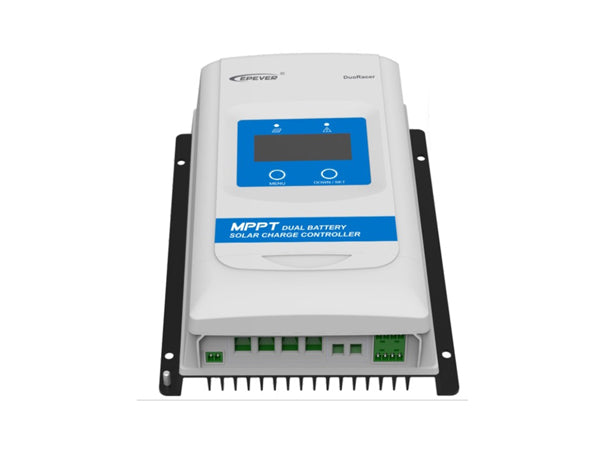 DuoRacer MPPT charge controller is made for charging two batteries at the same time in a solar system. This controller supports multiple battery types, including Sealed, Gel, Flooded, LiFePO4, and Li-NiCoMn. The device recognizes the start battery system voltage automatically, and trickle charges the battery when the required.