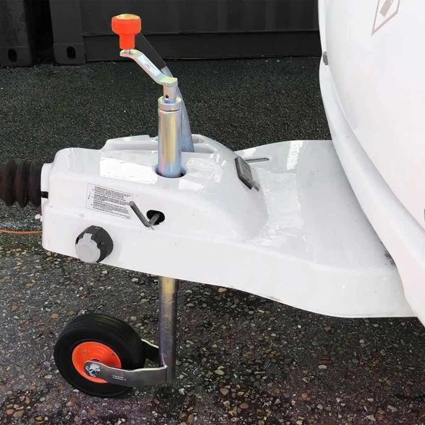 This jockey wheel incorporates an upgraded 2023 "Super Wheel" featuring a durable steel rim, domed rivets and an all-terrain rubber tire to withstand the demands of maneuvering and challenging conditions.