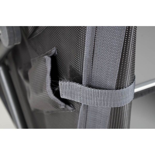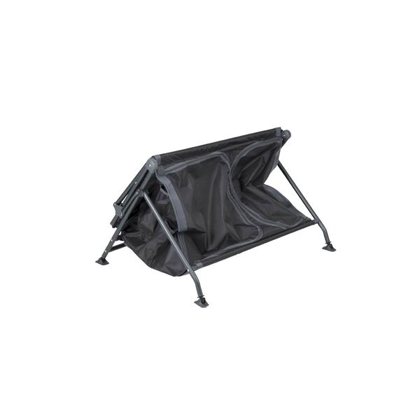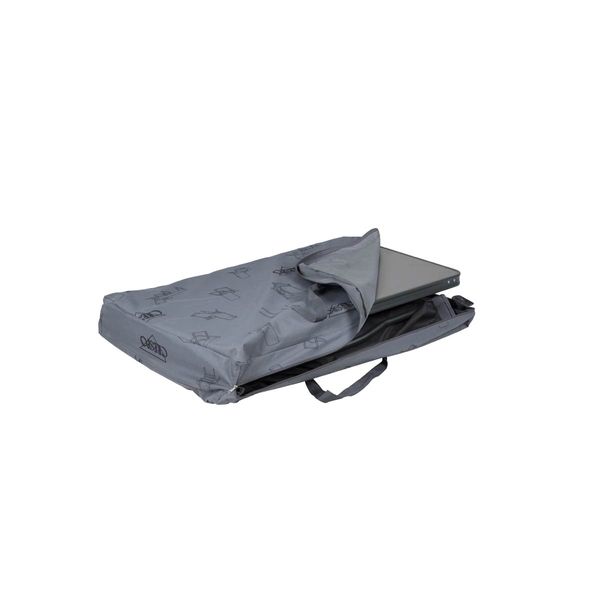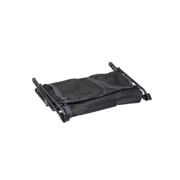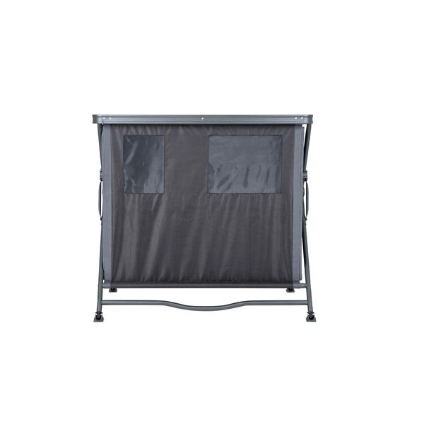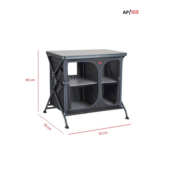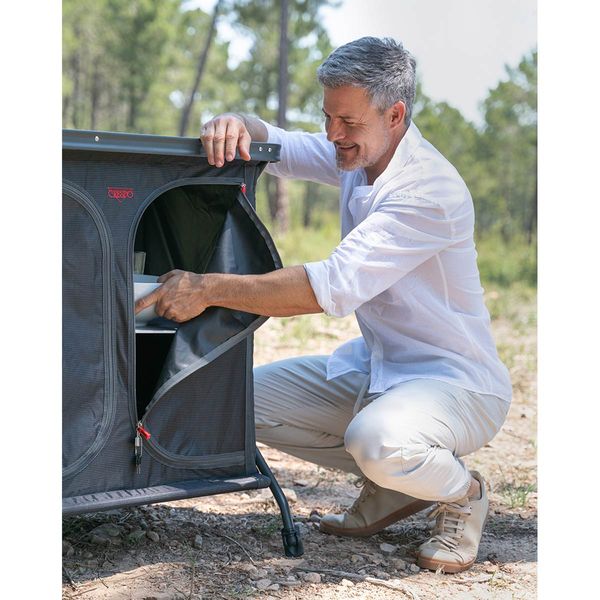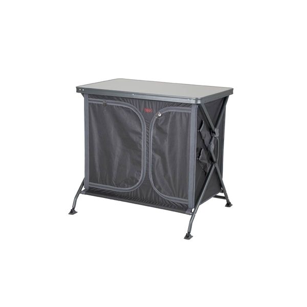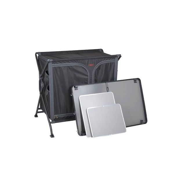 A stable and sturdy cooking station. easy to assemble thanks to its unique system for folding and unfolding! This cooking station/cupboard has a grey melamine top which is heat-resistant and waterproof. The stylish aluminium housing is in black. The cover is made of extra strong 400 denier polyester with 4 handy shelves on the inside, 4 side compartments and a mesh window at the back. The legs with stabilisers can be individually adjusted so that the cupboard is stable on any type of surface. The cooking station/cupboard comes in a carrier bag.