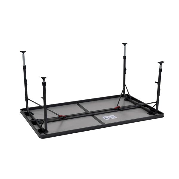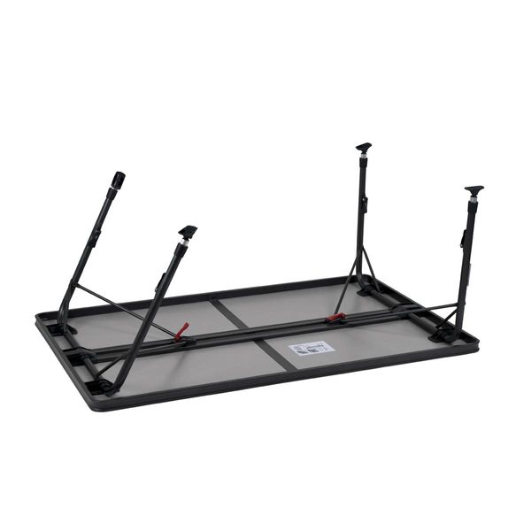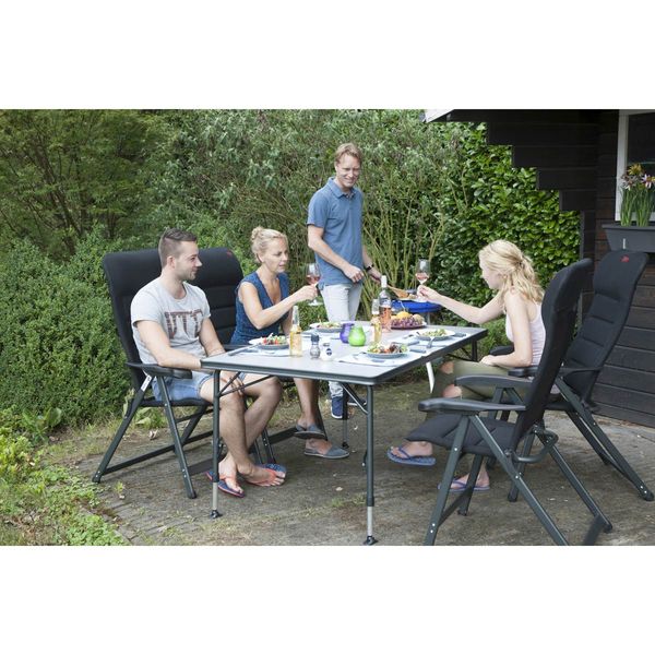 A stable high quality table. Thanks to its special construction this table is easy to open and close. In addition the feet are easy to mount in the guided aluminium rails on the underside of the table top. The table top is extra spacious so that it can accommodate up to 6 persons. The aluminium rails at the bottom of this camp table also provide additional reinforcement. The high-quality materials and heat-resistant and waterproof tabletop ensure a long service life. The feet provide high stability through the thick (28 mm) and extra-reinforced pipes. The stabilizing feet provide extra grip on any surface. This table is light weight because of the aluminium frame.