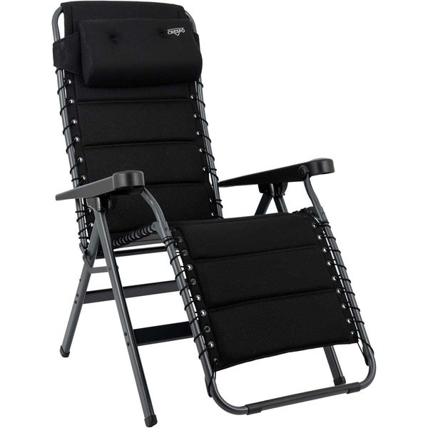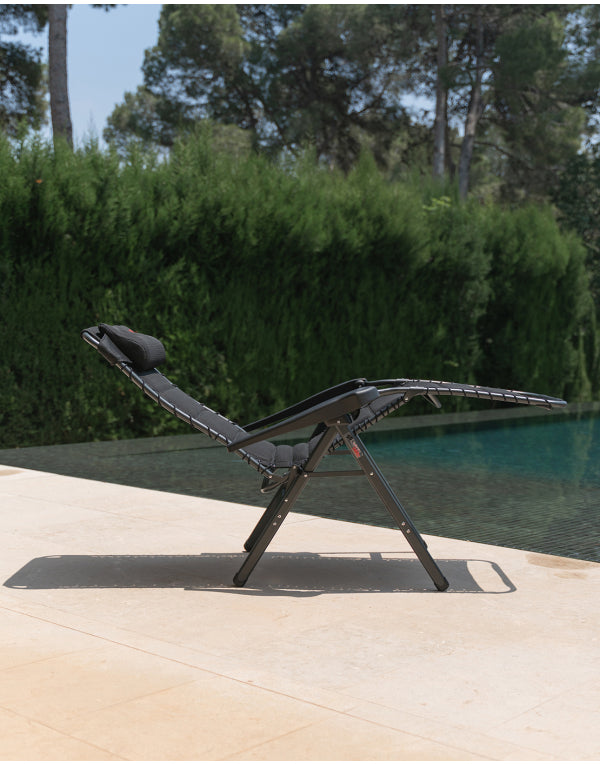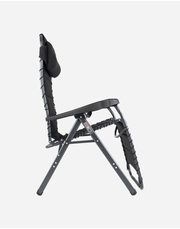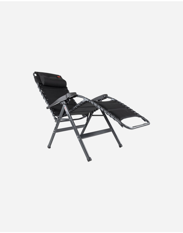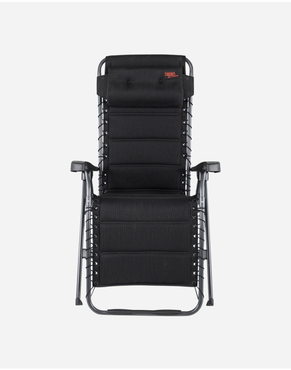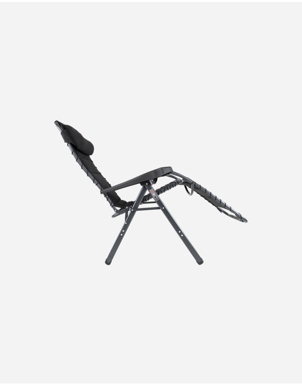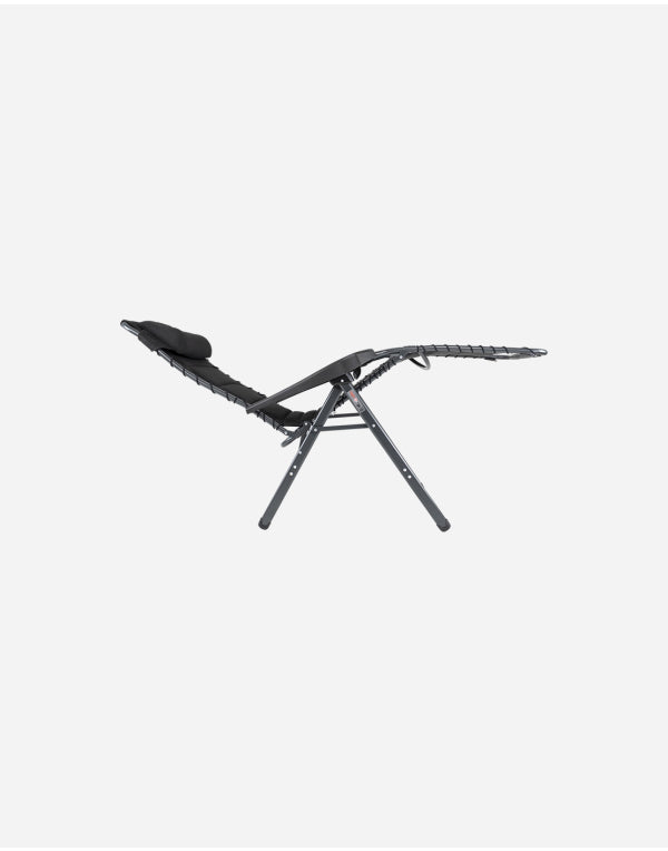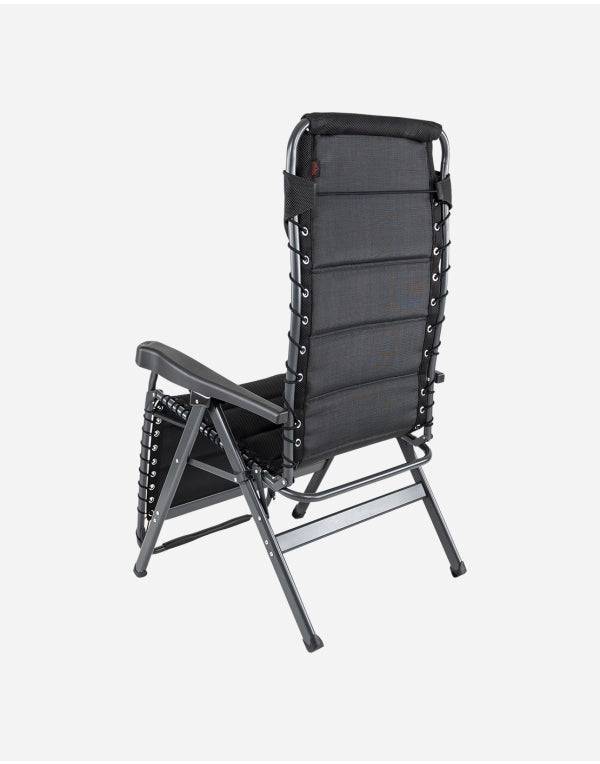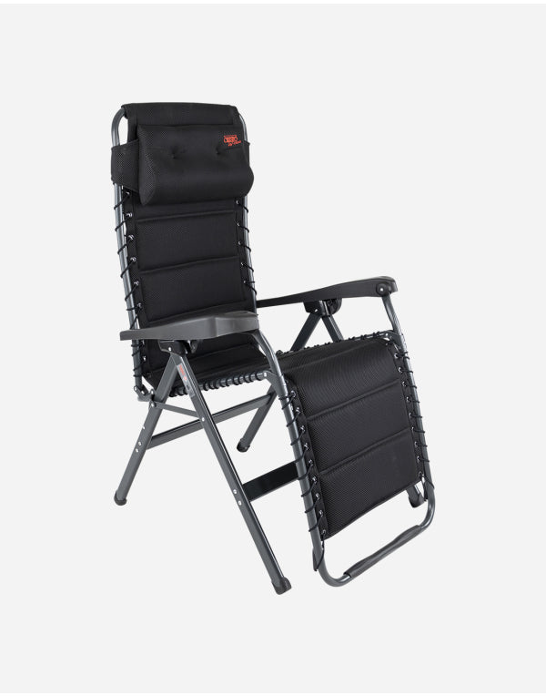 A luxurious and comfortable reclining chair with cushion for your head. This chair offers maximum comfort as it is continuously adjustable and is completely covered with 3D upholstery attached by elastic. The comfortable padding of this material allows for extra air circulation. In addition the finishing gives a stylish appearance. Both the back rest and the arms are ergonomically formed and the chair has been equipped with a braking system so that the chair can be fixed in any position. The chair has been given an anodised H-frame for extra stability and strength. The chair has an extra broad (54 cm) and extra deep (55 cm) seat with an extra tall back rest (50 cm). When folded, this chair is compact and therefore easy to take with you in the provided storage bag.