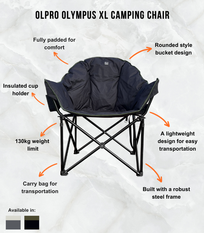 Built to withstand the rigours of outdoor life, the Olympus XL features a robust steel frame that guarantees durability and stability whilst the rounded style bucket design gives you ultimate comfort at festivals, the campsite or even at home in the garden.