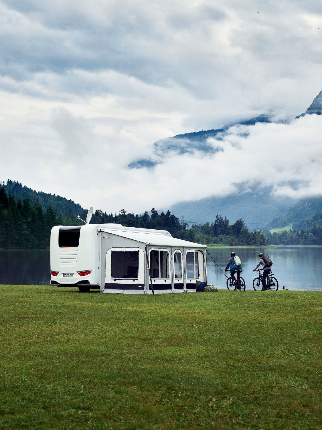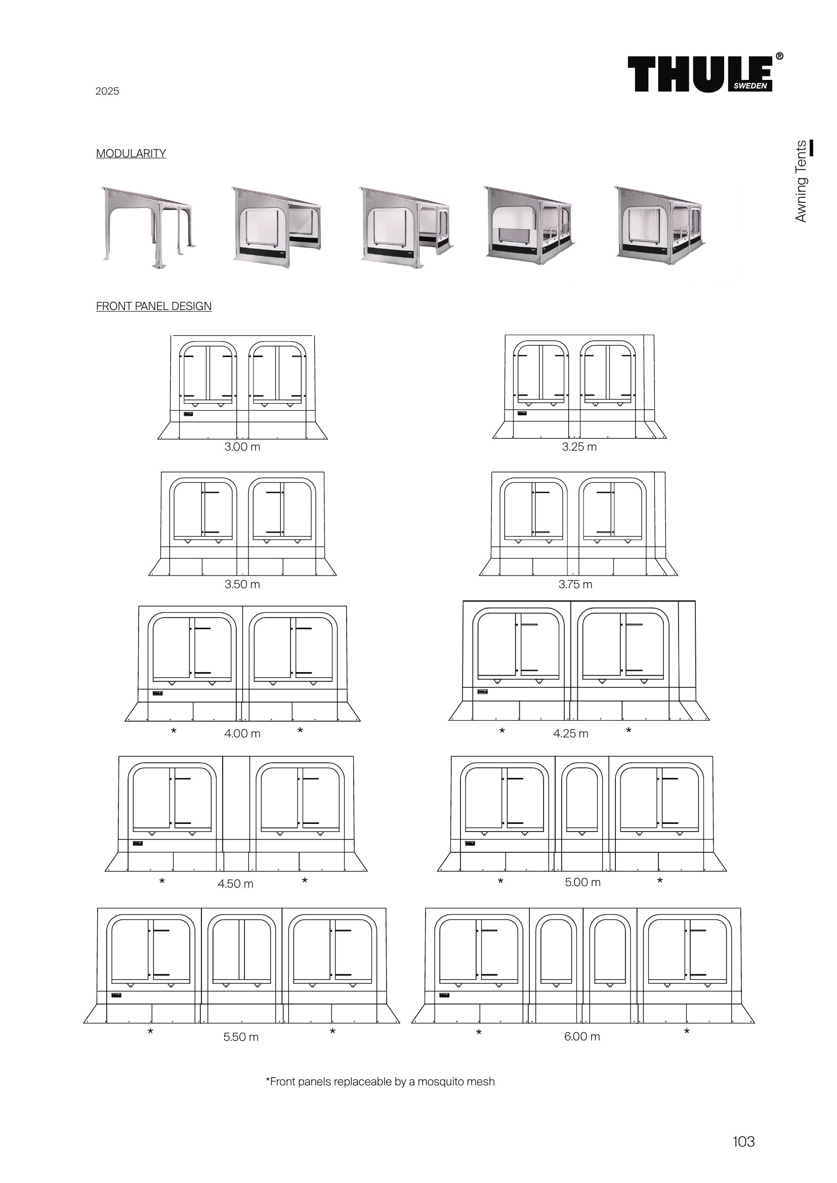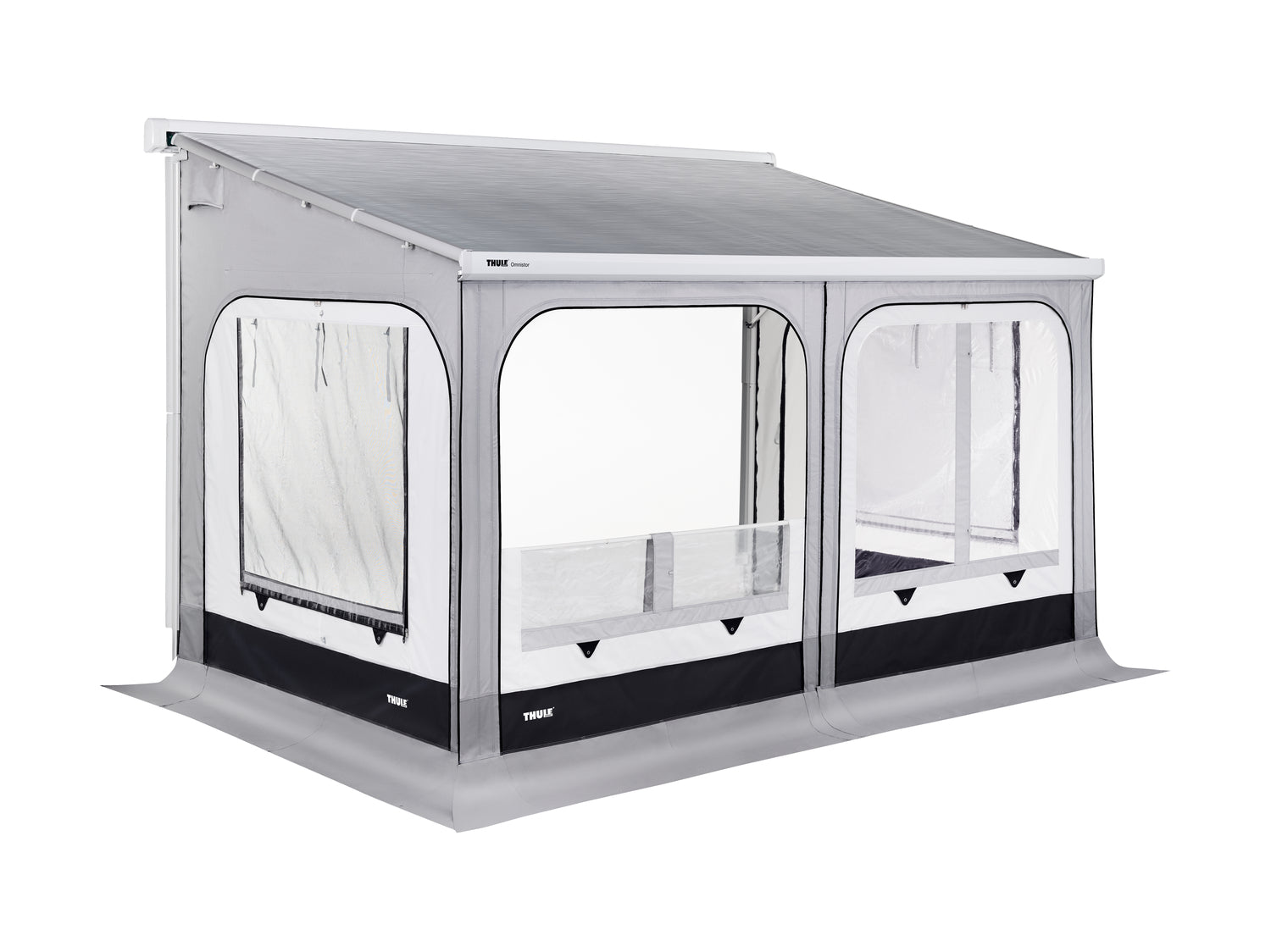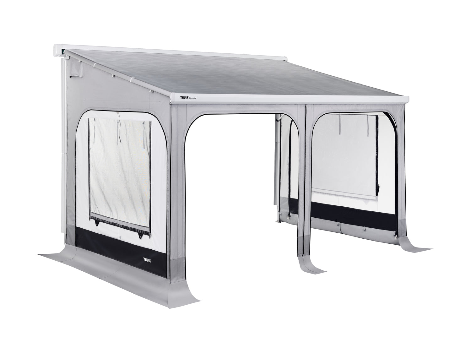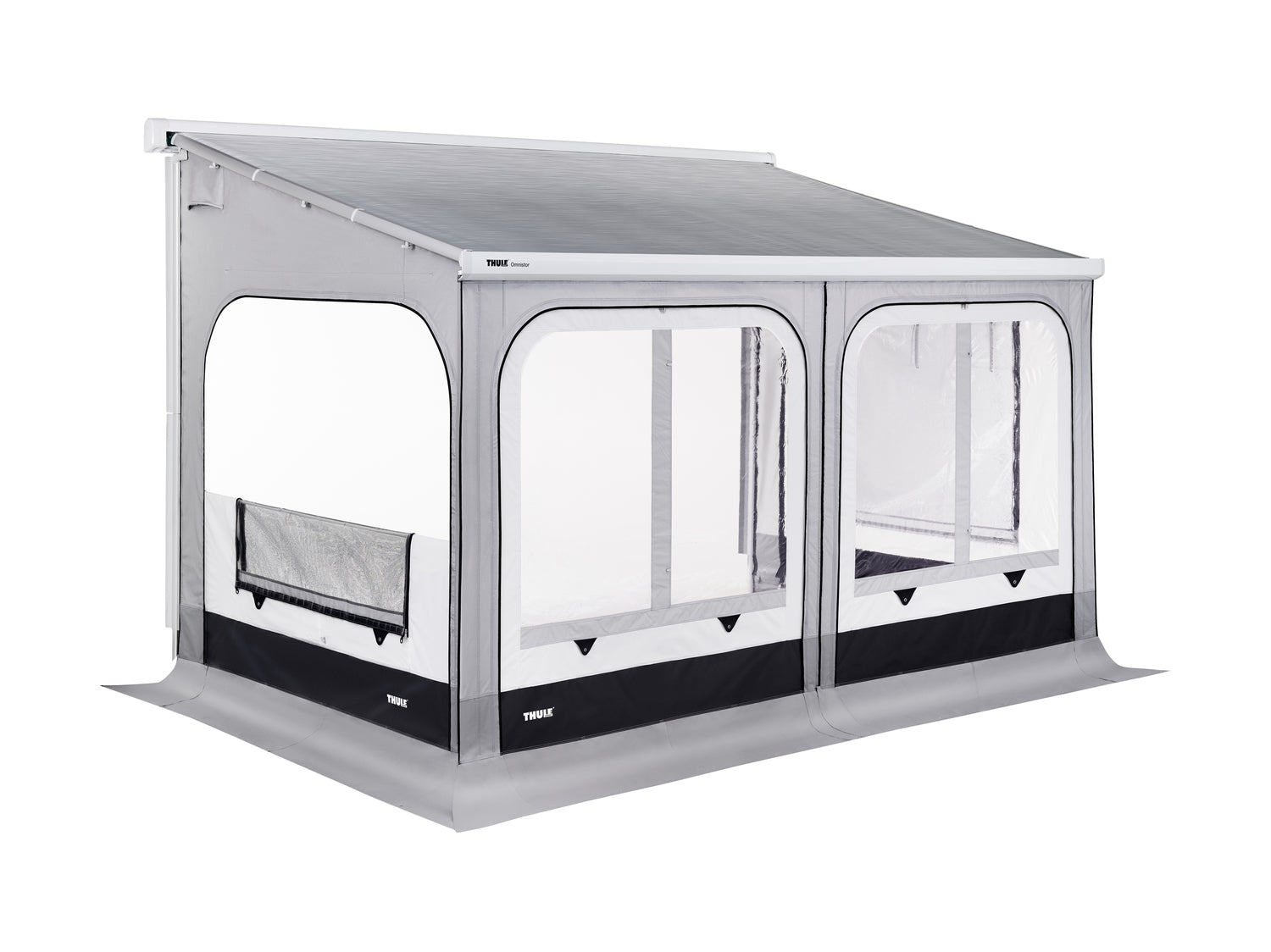 Side panels easily slide into the clamping profiles and the front panel slides into the awning lead rail.